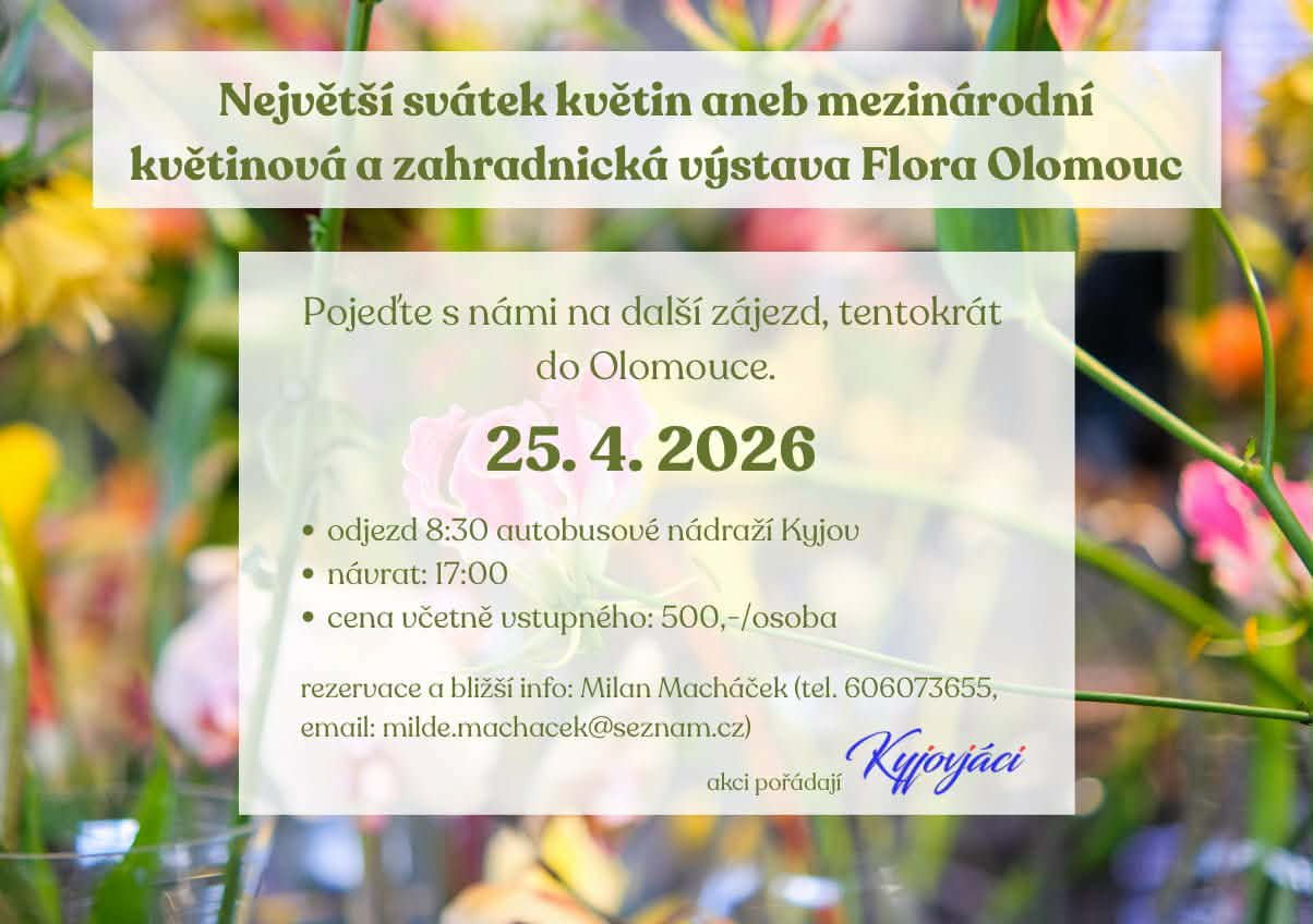 25.4.2026 je možnost zájezdu do Olomouce. Odjezd v 8:30 hod z Kyjova, návrat v 17:00 hod. více informací na tel. 606 073 655 Milan Macháček