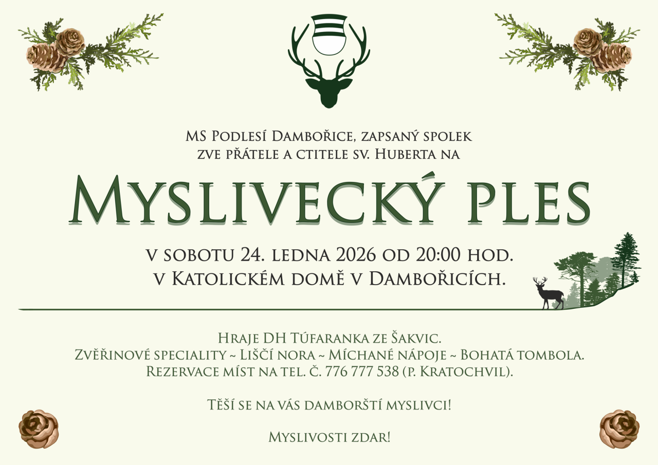 Těšit se můžete na zvěřinové speciality, liščí noru, bar s míchanými nápoji nebo bohatou tombolu. K tanci a poslechu hraje dechová hudba Túfaranka ze Šakvic. Rezervace míst na telefonu 776 777 538 u pana Václava Kratochvila. Na Vaši návštěvu se těší damborští myslivci.