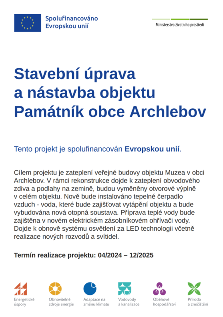 Projekt s názvem „Stavební úprava a nástavba objektu Památník obce Archlebov“ byl spolufinancován Evropskou unií. Jeho hlavním cílem bylo zlepšení energetické náročnosti budovy a modernizace technického zázemí muzea.